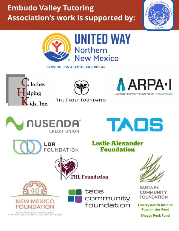 The Embudo Valley Tutoring Association (EVTA) was incorporated, as Embudo Valley Tutoring (EVTA), in 2004 as a 501(c)(3) nonprofit organization to support New Mexico's Dixon Elementary School, and strengthen the educational opportunities for children in the rural area surrounding the Rio Grande of Rio Arriba County in northern New Mexico. EVTA has provided continuous free tutoring and mentoring to children and youth of the Rio Grande and surrounding villages for 12 years. We provide free tutoring during the school day, after school, and during the summer. Beginning in 2010, EVTA began to stretch its resources and staff to serve children in other schools who needed reading interventionists, such as Velarde Elementary, and later, La Jicarita Community School in Penasco (now closed), Penasco Independent Schools, and Taos's Enos Garcia Community School and Anansi Charter School. It is our goal to extend our service offerings to as many children as we can reach with the resources available to us. During the COVID-19 crisis, EVTA has continued to serve its students by offering remote and socially distanced tutoring.